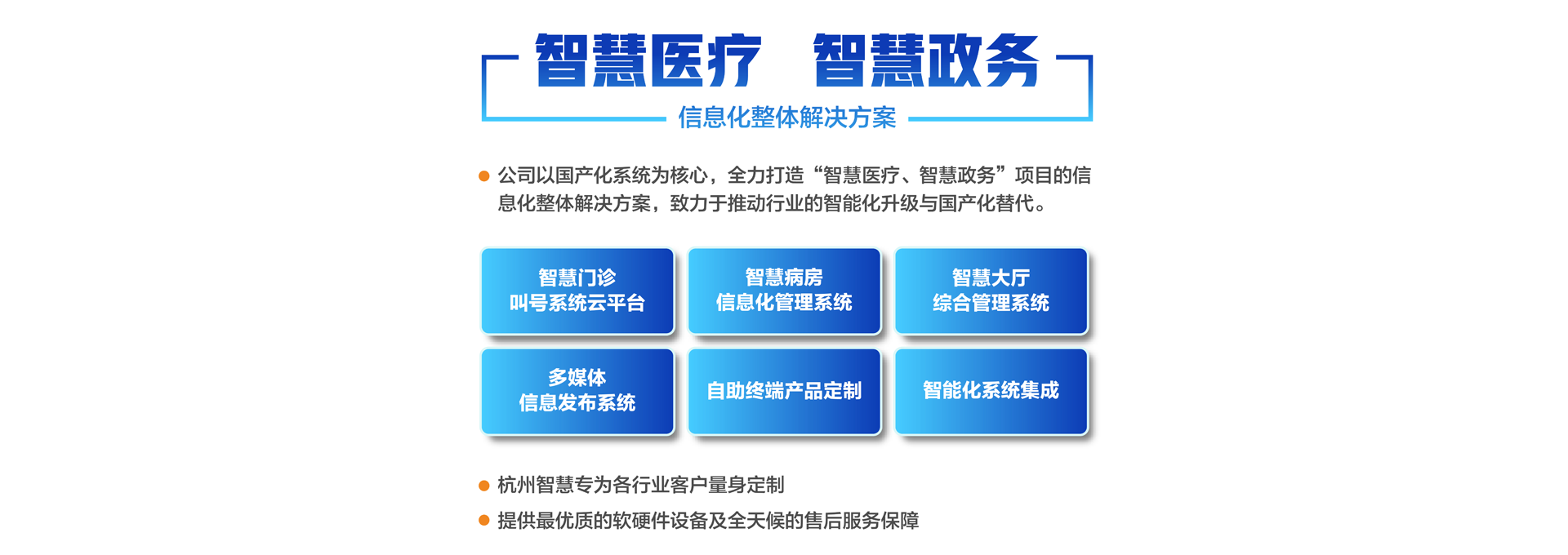 杭州智慧科技有限公司初創(chuàng)于2003年,總部位于重要的電子商務(wù)中心中國(guó)杭州公司主營(yíng)業(yè)務(wù)有:智慧分診叫號(hào)系統(tǒng)、智慧病房醫(yī)護(hù)對(duì)講系統(tǒng)、智慧大廳綜合管理系統(tǒng)、智慧政務(wù)管理系統(tǒng)、智慧多媒體信息發(fā)布系統(tǒng)、導(dǎo)診系統(tǒng)及各自助終端產(chǎn)品定制。專(zhuān)為各行業(yè)客戶(hù)量身定制。公司已有20余年行業(yè)經(jīng)驗(yàn)沉淀積累,擁有優(yōu)秀的產(chǎn)品外觀設(shè)計(jì)師和各類(lèi)中高級(jí)專(zhuān)業(yè)技術(shù)工程師,確保所研發(fā)的產(chǎn)品具有行業(yè)領(lǐng)先的外觀及可靠的技術(shù)性能。并擁有權(quán)威部門(mén)頒發(fā)的各類(lèi)知識(shí)產(chǎn)權(quán)及專(zhuān)利證書(shū),30多項(xiàng)資質(zhì)證書(shū)、800多個(gè)合作伙伴、2000多個(gè)項(xiàng)目成功案例經(jīng)驗(yàn)。 智慧產(chǎn)品已遍及全國(guó)各醫(yī)療、政務(wù)、金融、通訊、公安、工商、稅務(wù)等行業(yè),形成以“立足杭州、輻射長(zhǎng)三角、拓展全國(guó)”的戰(zhàn)略發(fā)展格局,產(chǎn)品經(jīng)過(guò)歷年不斷創(chuàng)新,形成專(zhuān)業(yè)化、平臺(tái)化,致力于成為智慧產(chǎn)品的領(lǐng)軍企業(yè)。 公司建立了完善的技術(shù)培訓(xùn)及售后服務(wù)中心,并設(shè)24小時(shí)熱線(xiàn)咨詢(xún)電話(huà)解答用戶(hù)反饋的問(wèn)題。同時(shí)應(yīng)客戶(hù)要求定期派技術(shù)人員到 全國(guó)各地進(jìn)行技術(shù)指導(dǎo)輔助用戶(hù)正確使用智慧產(chǎn)品并能獨(dú)立安裝、調(diào)試、日常維護(hù)等工作。提供最優(yōu)質(zhì)的設(shè)備及全天候的售后服務(wù)保障,智慧永恒不變的服務(wù)宗旨——致力于客戶(hù)的滿(mǎn)意與成功!...